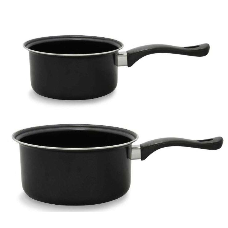 1.5qt and 3qt Non-Stick Saucepan Set to prepare your favorite sauces. Made from high quality carbon steel for long term durability. Color: Black 1.5 and 3 Quarts High Quality Carbon Steel Heats Quickly and Evenly Non-Stick Coating Dishwasher Safe Color: Black