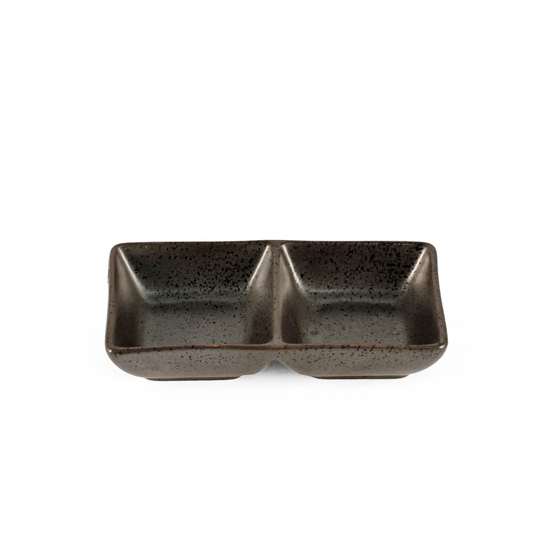 This small black compartment plate has a metallic design and serves sauce, condiments, butter, and pickles or one-bite portions.