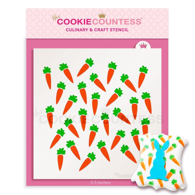 2 piece carrotstencil set, perfect for Easter. One stencil for the carrots and another for the leaves.Overall stencil size is approximately 5.5" x 5.5".PINK sections in image are the open sections.Stencils are 5mil Food Grade plastic, washable and reusable