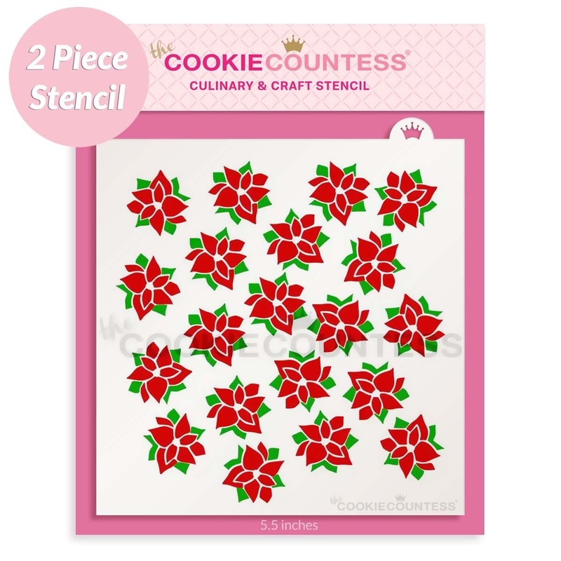 2 piece Poinsettiastencil set.Overall size approximately 5.5" x 5.5".PINK sections in image are the open sections.Stencils are 5mil Food Grade plastic, washable and reusable.