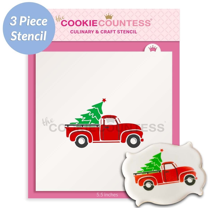 3 Piecevintage Christmas truck with tree stencilDesign size is 3.2" x 2.1"Overall size 5.5" x 5.5".PINK sections in image are the open sections.Stencils are 5mil Food Grade plastic, washable and reusable.Fits our Jamestown Hexagonor Ann Clarks 3.5 Circle a