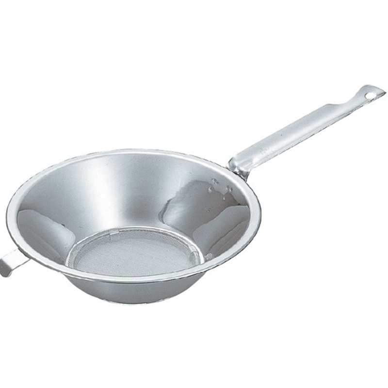 With a flat bottom, this strainer drains oil faster than regular chinois. The hook on the side stops the strainer from moving, preventing messy spills.