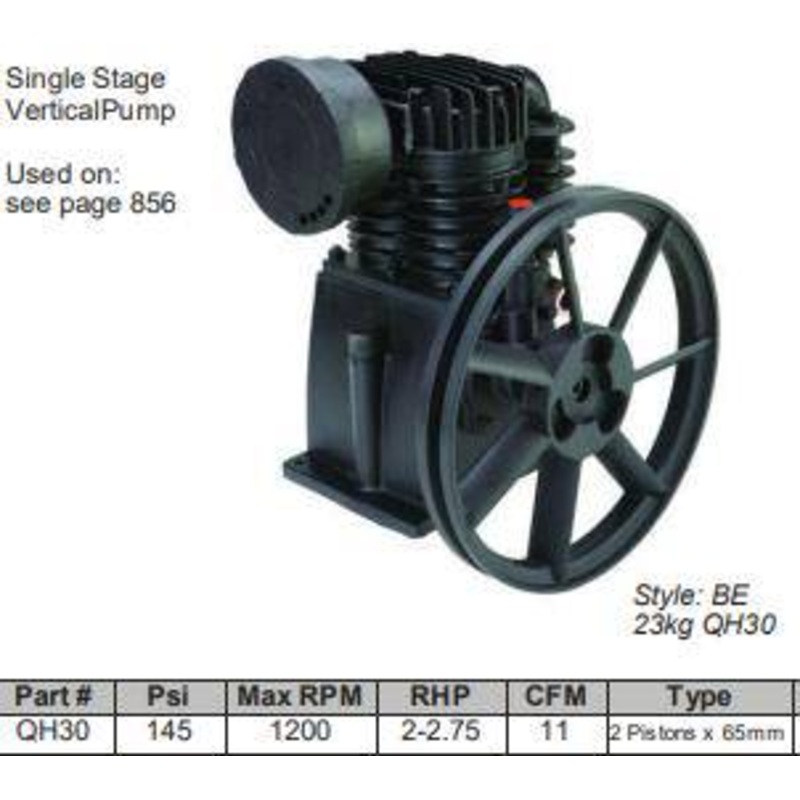 Vertical Air Compressor Pumps:QH30 Air Compressor Pump -Features & Specifications:145 PSI Max Pressure Rating2-2.75HP Required for Operation11 Cubic Feet / Minute Volume1200 RPM Max Operating Speed2 Pistons x 65mmCOS QH50L - Air Pump For TB-3070/TB-30160CO
