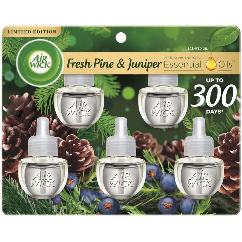 Enhance your homes scent with Air Wick Scented Oil Refills infused with 100% natural essential oils. Air Wick Scented Oil Refills release continuous fragrance for up to 60 days (based on low setting) so your home smells welcoming. Our latest Air Wick scented oil warmer optimizes airflow for 360 degree fragrance diffusion, reaching every corner of the room for a consistent fragrance experience. The Air Wick Scented Oil warmer also allows you to choose between 5 fragrance settings for just the right amount of fragrance. It continuously diffuses and carefully blends fragrance throughout your home, office, or any space.USE IN ANY ROOM: living room, bathroom, bedroom, hallways, kitchens and office. WARMER: Easy adjust warmer with 5X fragrance settings. Refills are compatible with all versions of Air Wick plug in warmers. ESSENTIAL OILS: Infused with natural essential oils for a better fragrance experience. VALUE: Provides up to 300 days of continuous and long-lasting fragrance based on low setting. FRAGRANCE: Fill your home with freshly cut holiday pine tree, mingling with the scents of fresh berries.Best Sellers Rank: See Top 100 in Health & Household. Power Source: Oil. Item Form: Oil. Brand: Air Wick. Color: Multicolor. Scent: Fresh Pine and Juniper. : B07R9Q1L35. Manufacturer: Us/RECAS. Date First Available: April 29, 2019. Item model number: 94haeo-5. Product Dimensions: 2.07 x 8.06 x 6.89 inches; 3.36 Ounces.