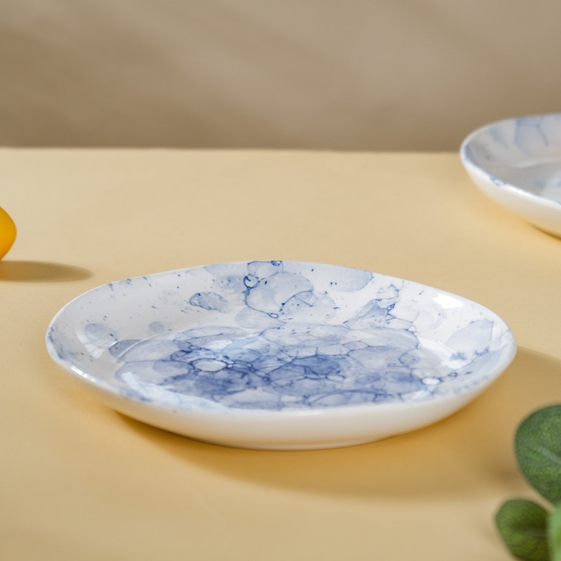 The blue and white bubble art patterned appetizer plate is sure to add a touch of creative elegance to any table setting. The appetizer plate can be used to serve snacks, starters or fruits. The ceramic plate is sure to leave a lasting impression on the guests with its classic and contemporary appeal.