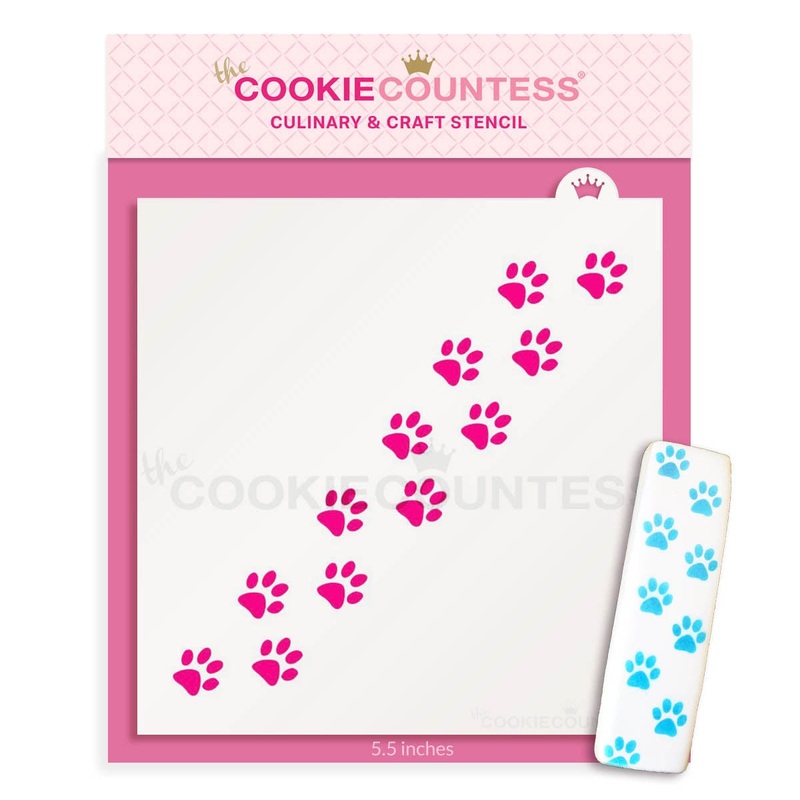 Animal trailstencil. Cute dog or cat pawprints.Overall size approximately 5.5" x 5.5".PINK sections in image are the open sections.Stencils are 5mil Food Grade plastic, washable and reusable.Made in the USA.