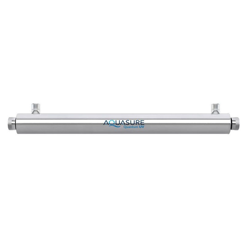 Ultraviolet (UV) light is found on the light spectrum just below visible light. Its natural power has germicidal properties, allowing it to be used as a pathogen reduction method that does not require the use of salt or harmful chemicals. For this reason, UV is an ideal solution for homeowners on well water, which typically sees higher levels of bacteria and viruses as a result of environmental impacts.Enter the AQUASURE Ultraviolet UV Water Filter system. Dont let its small footprint fool you, this system is 99.9% effective at reducing waterborne pathogens and uses as little energy as a 25-Watt-or 40-Watt lightbulb. The AQUASURE Ultraviolet UV Water Filter system removes 99.9% of these contaminants and gives you the clear mind of never worrying about a boil water alert or notice again. This system pairs well with any of our other whole house water filtration systems. Take your whole house water purification to a higher level.