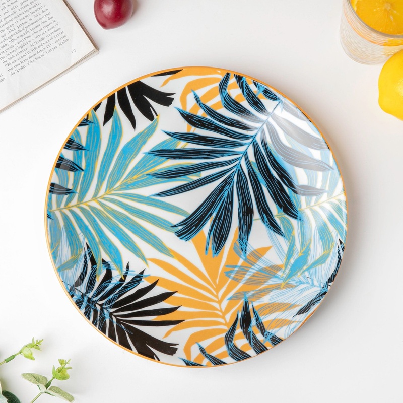 Transport straightaway to a tropical paradise with leaves printed on the round ceramic dinner plate. With a semi-matte finish, the dinner plate is a fine example of decal artwork and precision. Perfect for luncheons or outdoor dinner parties, the plate of sturdy ceramic construction is crack and chip-resistant. Just the addition of the ceramic dinner plate to the table will instantly brighten up the spread.