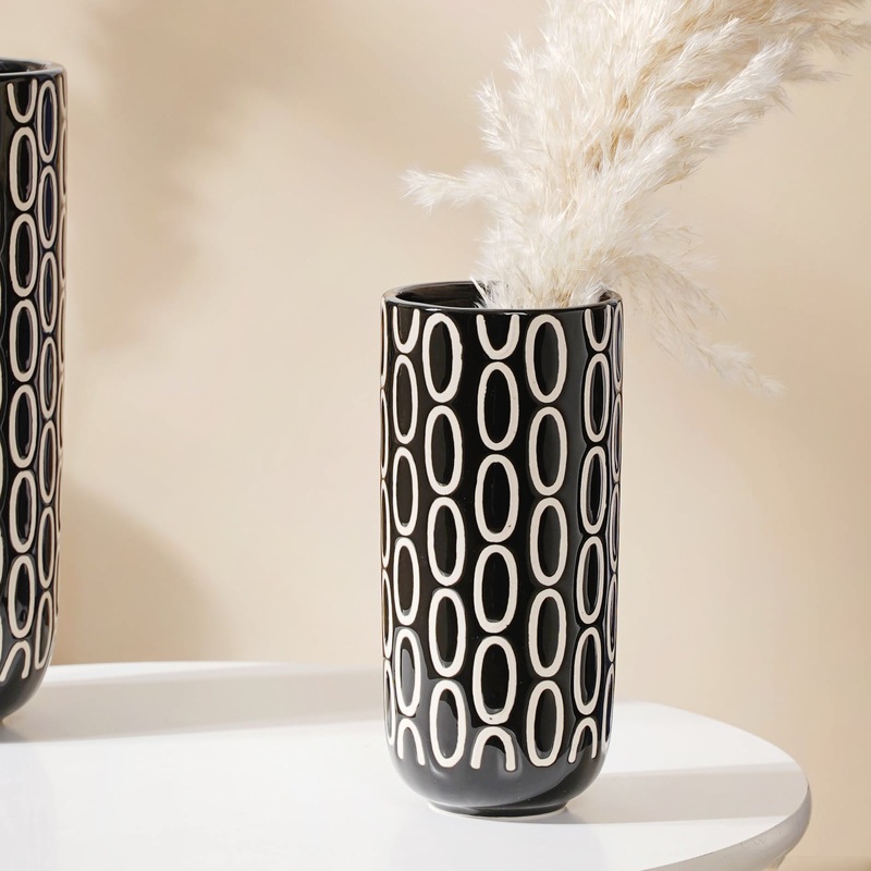 The pot is structured like one tumbler, having white-lined spheres filling the entire black body. It’s fashioned like a short drinking glass, with plenty of room for flower petals. In any stylish setting, the vase is a stunning and eloquent compliment.