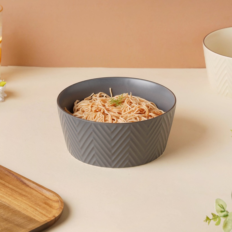 The chevron bowl with black rim brings grace and elegance on the dinner table. Usher in a magnificent family dinner by laying the table with the grey ceramic bowl which is crafted in modern and minimal design. Serve noodles, pasta, rice, nuggets or any delectable in this ceramic bowl.