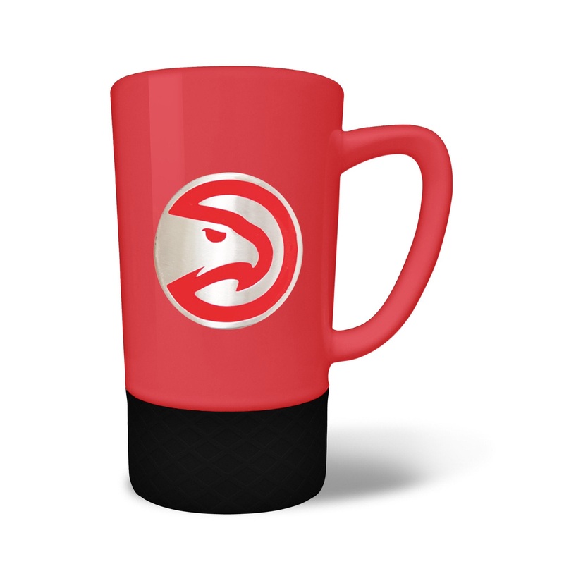 The 18 oz. JUMP team color ceramic coffee mug features a silicone base in coordinating team color and a hand crafted metal emblem.