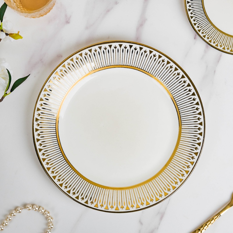Create a lasting impression on guests, with the refined ceramic dinner plate. A broad intricate gold pattern graces the rim of the plate, adding a royal aura to any cuisine. Serve an ideal portion of pasta or some curry and rice with garnishing of choice, on the plate. With ecstatic opulence, the ceramic plate captures royal aesthetics with exemplary rendition.