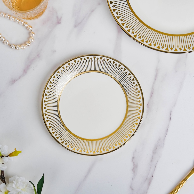 The ceramic dish with its gold and royal blue patterns defines opulence and durability. The plate is sumptuous and has been manufactured with high-quality, chip-resistant ceramic that is sure to provide the finest dining or snack-time experience. The stark glazed white of the ceramic is perfect in contrast to the lustrous gold, making them stand out on the table.