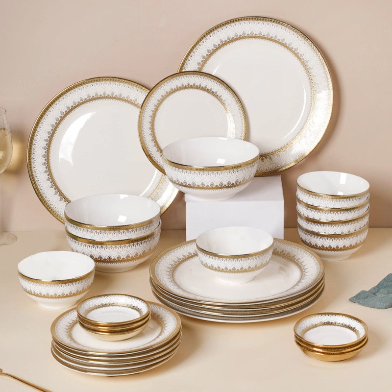 The embossed Aurelea dinnerware in a combination of peaceful white and luxurious gold is designed to set the dinner table a class apart. Use the 27 piece dinnerware to spread a delightful meal for family and friends as one dines in style. Serve, style, and celebrate every occasion, be it a housewarming, a get-together, or a formal dinner, using the dinnerware for 6. Featuring a distinct floral pattern and blending it with abstract designs, the plates and bowls along with the spoons add a touch of elegance, charm, and sophistication to the kitchen racks and the dining area. The dinner set adds warmth, comfort, and royalty, to simple home-cooked meals. To add a unique touch to the setup, use leaf mats and coasters from the collection to your setup.