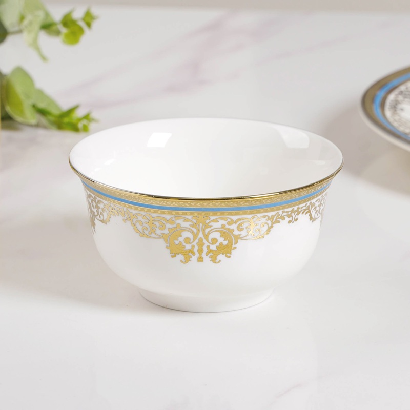 The Ivory Gold Rim Bowl has been moulded with expertise to elevate the dinner or snack-time experience. The rim is adorned with intricate gold floral patterns and will add a touch of elegance to the dining room. The bowl is sure to bring a slew of adoring gazes when presented on the table. Serve sweets of choice in the bowl including Turkish delights, gulab jamuns, or sorbets.