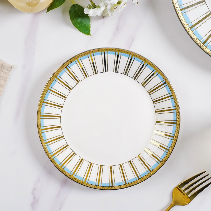 Give the snack-time table setting a boost with the starkly glazed ceramic snack plate. Gold and royal blue patterns adorn the rim of the plate, increasing its elegance and vibrancy. The ceramic plate is a superb way to serve guests while wowing them with its sheer amount of elegance. The plate is ideal to be presented on the table during festive dinners or luncheons.