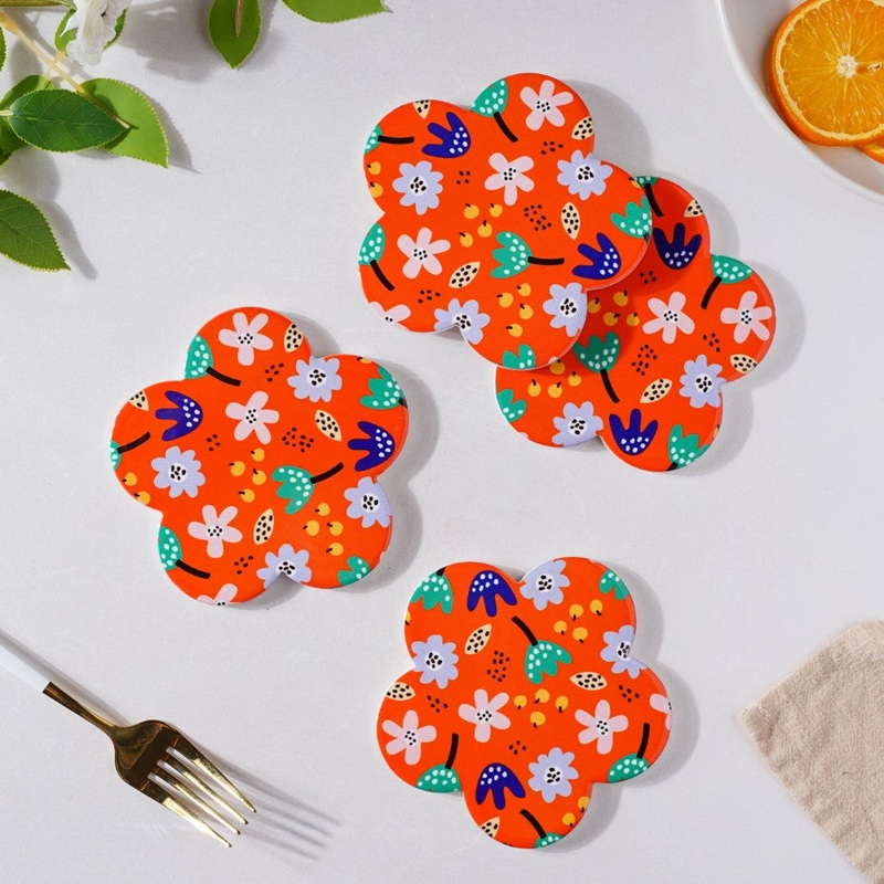 A cozy approach to enhance the decor for fall is to add some rusty orange. The emotional body is energized by orange, fostering feelings of happiness, health, and joy. Orange is regarded as the color of autumn. As much as we see the leaves turning pale and drying, in some corner of the park of greenery, a bunch of white flowers blooms merrily in this season. The coaster is a mini depiction of the scenic beauty that we often miss capturing. On a blanket of orange, flowers are seen to be blooming, bringing a refreshing aura to the home.