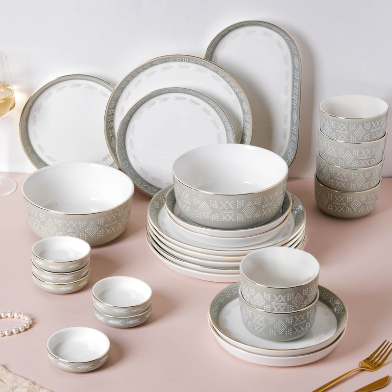 The Azo tableware set of pastel grey dinnerware combines glam chic with organic designs to create an unsurpassed symphony of beauty and charm. 6 dinner plates, 6 side plates, 6 side bowls, 6 mini flavor plates for sweets, desserts, condiments, or sides, 1 oval rice platter, and 2 serving bowls are included in the set. It’s fantastic how in this dinnerware collection minimalism becomes the meeting point for both modernity and history, bringing a gorgeous charm to the table. Our Azo collection of crockery is a ceramic dining must-have: it looks elegant with a basic yet striking texture that’s pure visual candy. Azo foregoes the ordinary in favor of the regal; it’s a timeless classic that stands out; it’s a daring foray into the realm of gorgeous tableware!