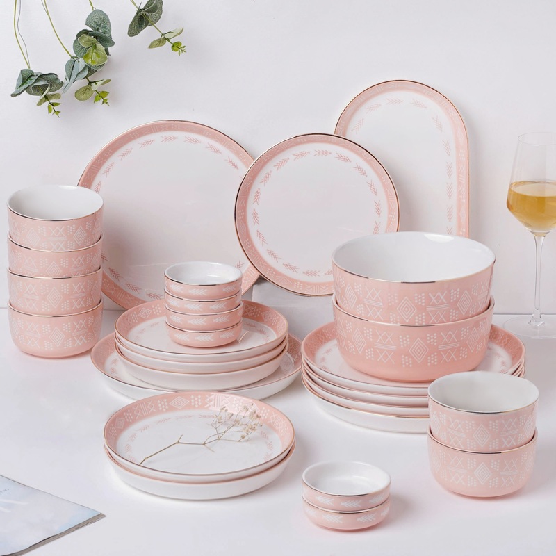With the sophisticated assortment of tableware from our stunning Azo line of crockery, luxury has no bounds. The brilliant combination of pearly white and glossy baby pink with golden rims lends an aristocratic atmosphere to the set, making one feel like r