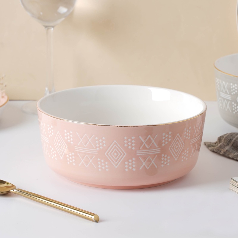 The ceramic serving bowl features a delicate pastel pink colour and a unique Aztec patterned surface. The gold rim of the bowl adds to its opulent design while the spacious interior makes serving an easy feat. Serve rice or curries in the bowl during the main course meal and bowl of popcorn in the bowl during a movie night with friends. The high-quality ceramic build of the bowl guarantees longevity even with daily usage.