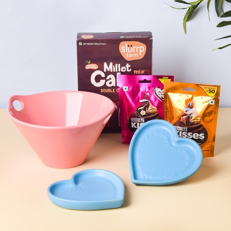 A celebration without a cake? Never! But, for baking a delicious cake, the most important things are- sturdy bakeware, beautiful serve ware, a cake mix, and delectable toppings. has packed the ultimate “cake it till you make it” gift hamper. The hamper comprises a very berry pink serving bowl that has a space to hold chopsticks. So, it can be used as a bowl to mix the batter or as serve ware. The heart-shaped plate will help you serve the slices of cake symbolizing you are serving them with all your heart.