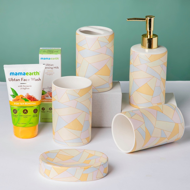 Nestip: The tumblers from the bath set in the hamper can be used to keep toothbrushes and toothpaste along with other morning essentials.