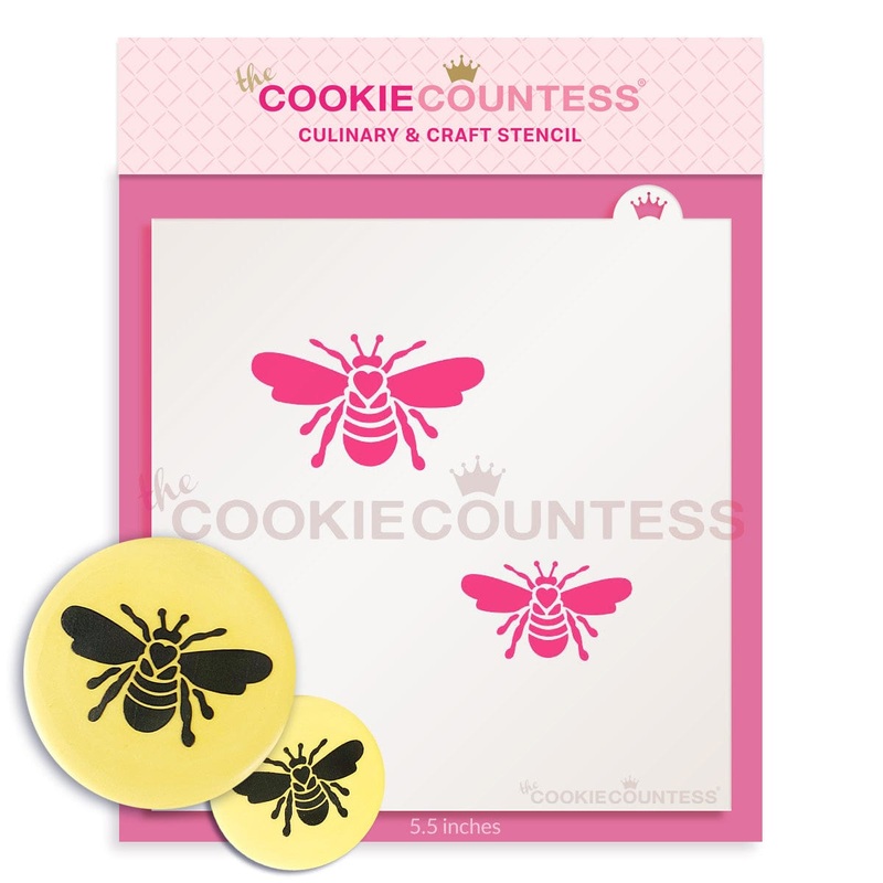 Honey bee2 sizesstencil. Design sizes are 1.5" and 2.25".For easiest application, use with the Cookie Countess Stencil Adaptor Set.The small bee will also fit an Oreo, or inside the Monogram Collection stencils.Overall stencil size is approximately 5.5" x