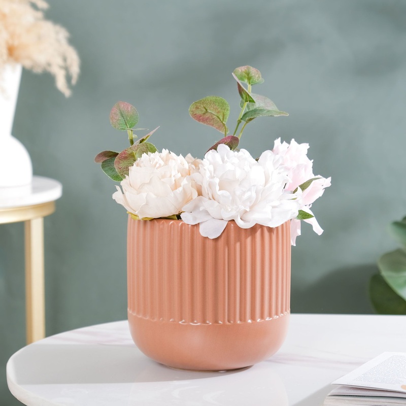 If you’re searching for a vase that’s made of good quality material, is textured and pastel-hued to use as a perfect modern centrepiece, the ribbed brown one will be your go-to choice. The smooth finish and matte finish make it, undeniably, a favourite of all those who admire contemporary interior design. The plain colour of the vase ideally allows it to blend with other bright colours when kept as a mantelpiece, on the shelf, coffee table, study table, window sill, or in a living and bedroom.