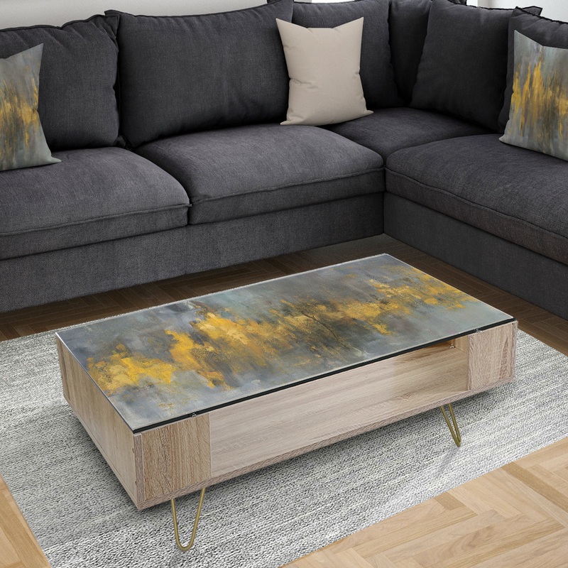 Bring an artistic flair to your decorating style with this ‘Black and Gold Glam Abstract’ Designart coffee table. The elegant pattern is printed directly on the underside of the clear glass top, which protects the artwork from damage in a busy home. Goldtone metal hairpin legs coordinate with the print for a unified effect.
