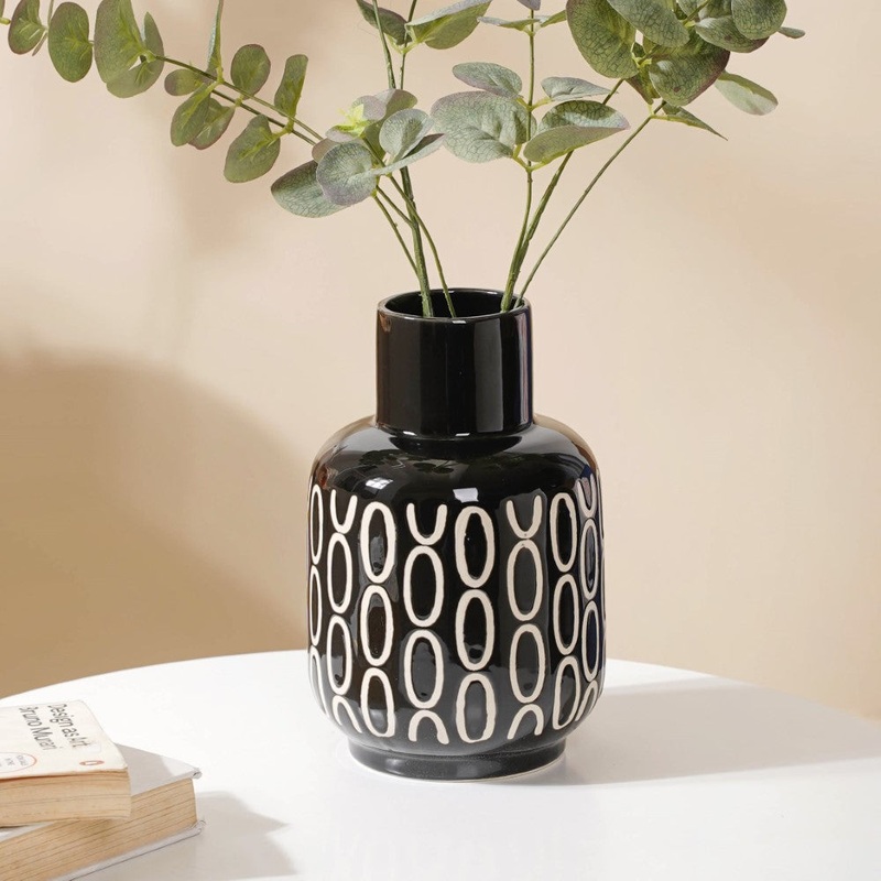 In any modern setting, the grand, elegant ceramic vase is sure to add opulence. The most in-demand trend has always been a magnificent blend of black and white, and that’s what exactly is brought by the flower vase. Its artistry consists of a chic black mosaic body with white circular motifs.