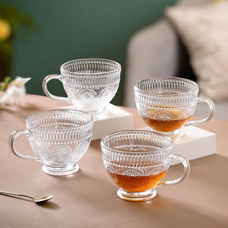 Leave an everlasting impression on all those whom you serve in the intricately textured flower embossed glass cups. The durable yet stylish cup set of 4 with floral designs will dress up the table with true elegance and ensure that one’s snack time with friends or family is truly cherishable. The cups are crafted from sturdy, chip-resistant, food-safe glass material, making them ideal for everyday use. Whether it’s hot piping ginger milk tea or a refreshing cup of lemon tea, the floral embossed glass teacups are truly versatile.