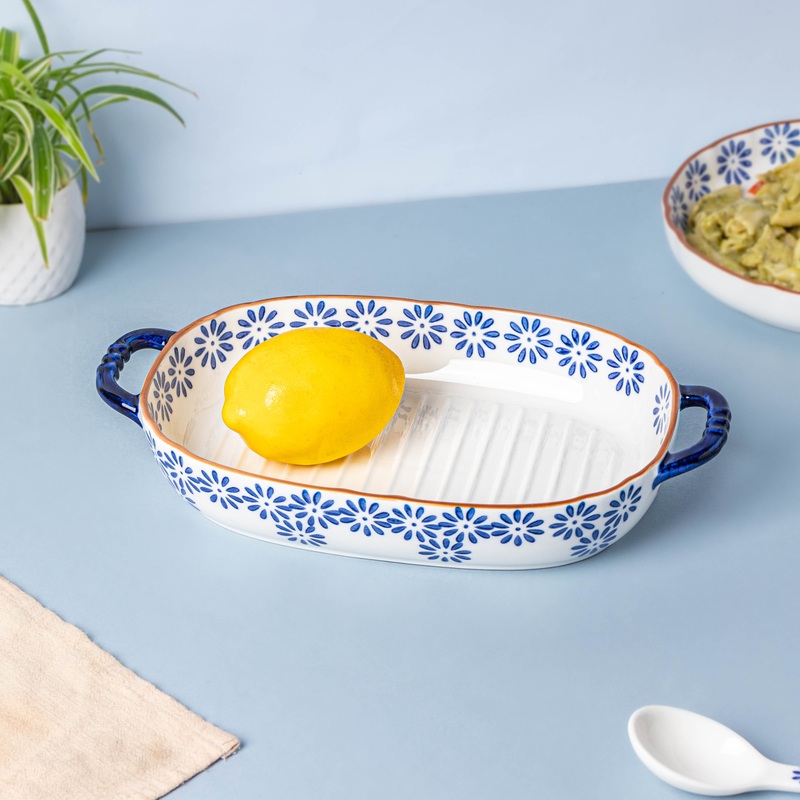 A brightly colored ceramic baking bowl with a blend of elegant white and soft blue flower motifs is bound to be one's first pick. The vibrant tray-shaped dish with handles on both sides may be used as a baking and grilling pan for vegetables and meats. At