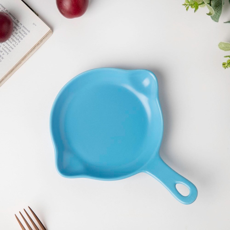 The sleek blue tray with handle features two grooves on both sides to pour over any gravy dishes. The baking tray in the form of a skillet will double up as a snack dish. One can serve finger foods, momos and an array of snacks to the guests in thus round ceramic plate.
