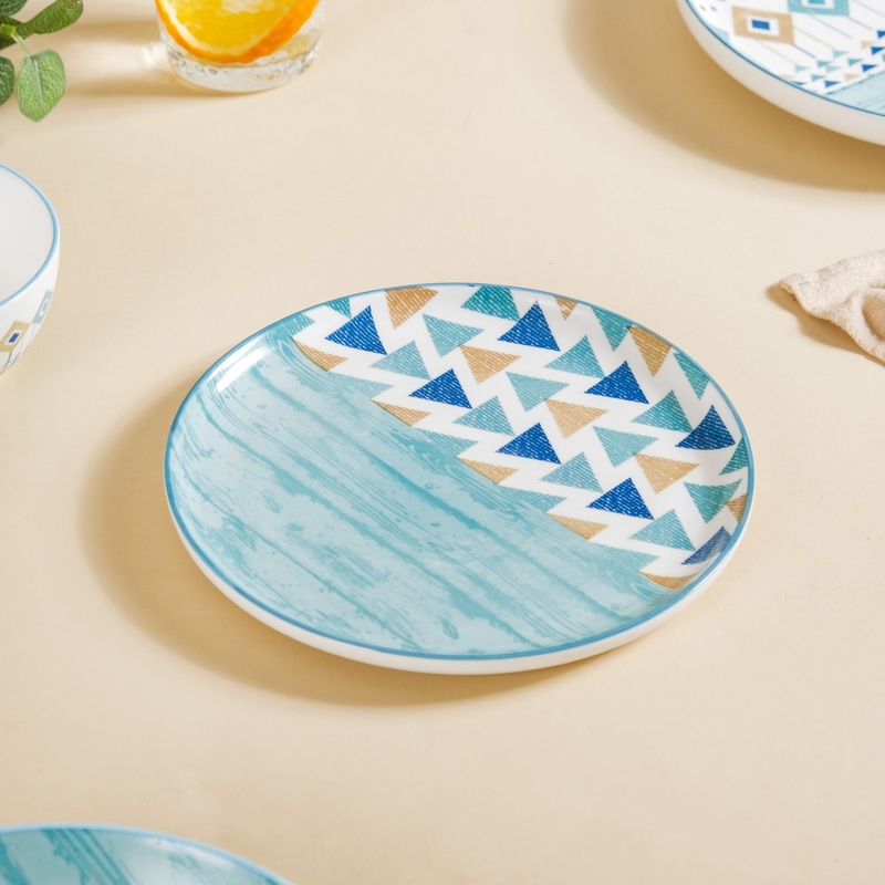 The round plates with abstract motifs in blue with a bit of yellow make a most elegant addition to one’s crockery collection. The plate is traditional and represents a whole new way of using subtle tones. The plate is made of high-quality ceramic material that can be used to serve both dry snacks as well as curries. The solid white base of the plate allows the pattern to stand out.