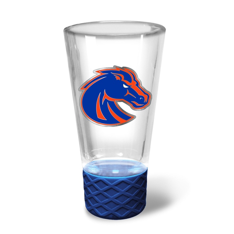 This 4 oz. round glass shot has a 3-dimensional team emblem with a team color silicone grip.