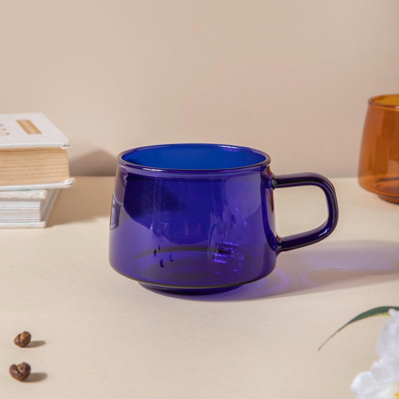 Enliven the table decor with this bright blue cup and serve tea, coffee, hot chocolate, or any beverage to friends and family. Stock similar glass cups of variant shades to host a get-together party or a high-tea event. Crafted in borosilicate glass, the blue mug is durable and heat-resistant.