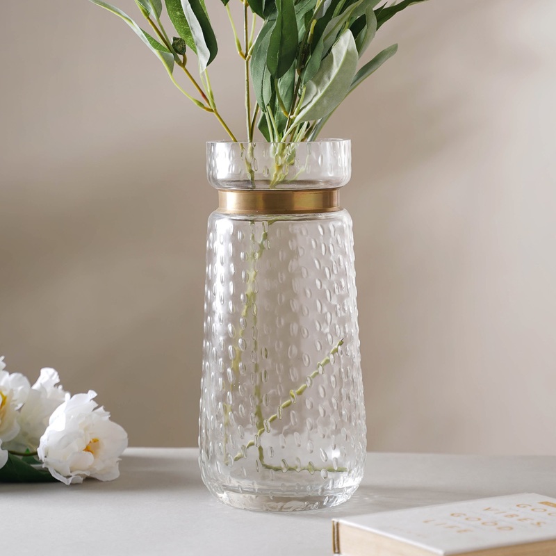 The glass vase for flowers layers effortlessly and may thus be used in any setting, formal or informal. The vase’s stylish shape and dotted design make it simple to decorate tables and shelves. The stunning hand-blown glass vase is the ideal addition to any coffee table or dining table setting. The textured crystal glass vase is a lovely gift for friends and family at a housewarming party. The glass has a metal plate in a golden hue around the middle which adds to the charm of the flower vase.