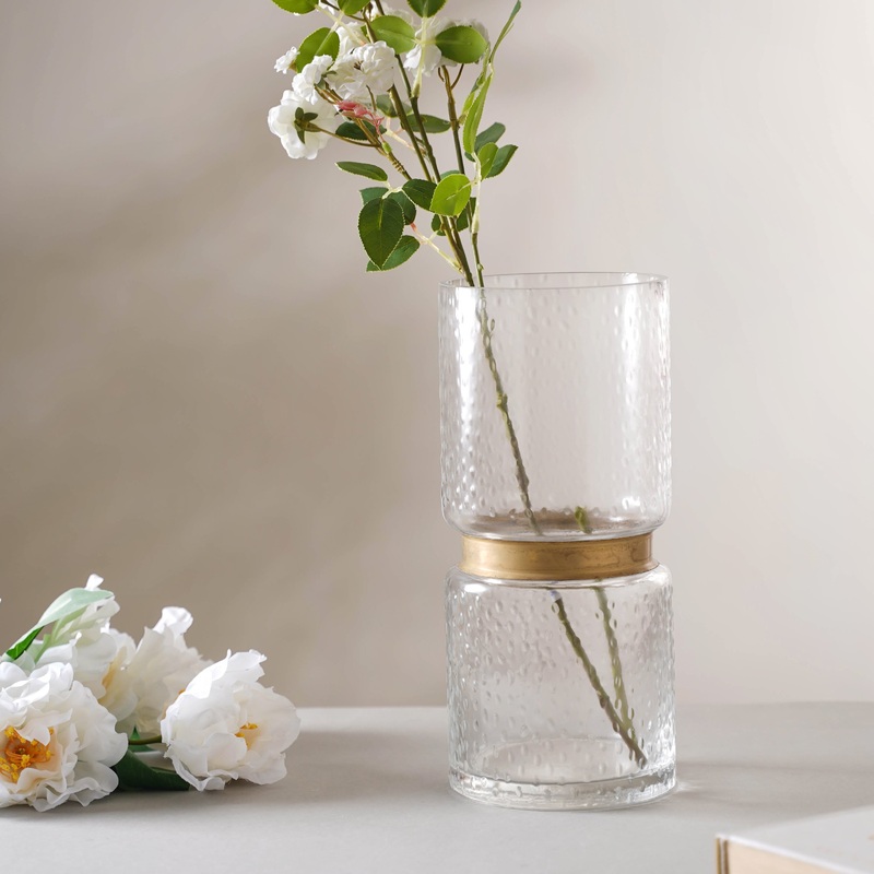 The glass vase for flowers layers easily and can be used in a professional or informal setting. Because of the vase’s simple shape and design, it’s easy to decorate tables and shelves with it. The beautiful hand-blown glass vase with a dotted texture on the outer surface will look great on any coffee table or dining table. The textured crystal glass vase is a beautiful housewarming present for friends and family. The glass has a golden metal plate across the middle, which adds to the flower vase’s beauty. The beautiful vase can be gifted to friends and family on special occasions like weddings, anniversaries and birthdays.