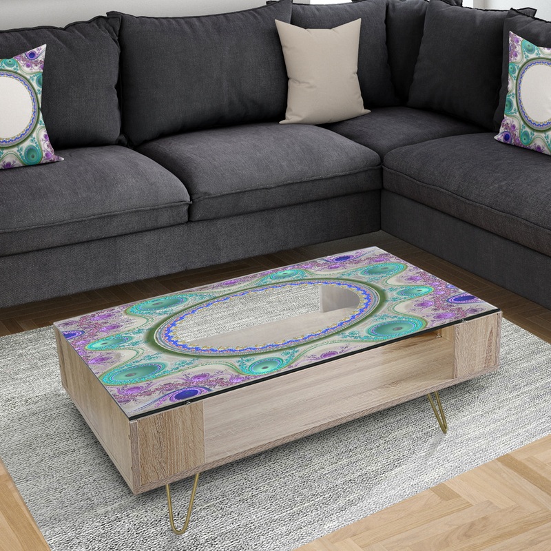 Pair your neutral decor with this bright and colorful modern coffee table by Designart. The vibrant print beneath the glass easily stands out against a neutral decor scheme for a striking contrast. This table features a lower shelf for you to conveniently store books or magazines, and the top is an ideal spot for serving drinks and snacks.