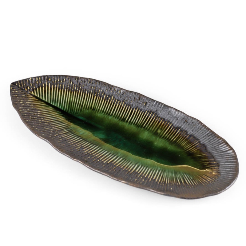 Its unique shape and distinctive color make it ideal for serving appetizers such as sushi rolls, sashimi, or main dishes, adding a touch of elegance to your presentation. It is also suitable for desserts, where the contrast between the plate’s green hue and the colors of your sweets creates a visually appealing display.