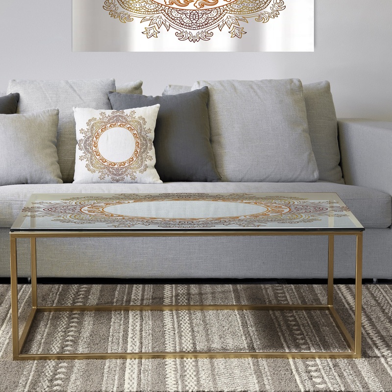Center your living room around the exquisite mandala motif of this coffee table. Perfect for bohemian, contemporary, or eclectic homes, this table showcases an intricate abstract pattern in warm yet subtle colors, while the transparent glass top protects t