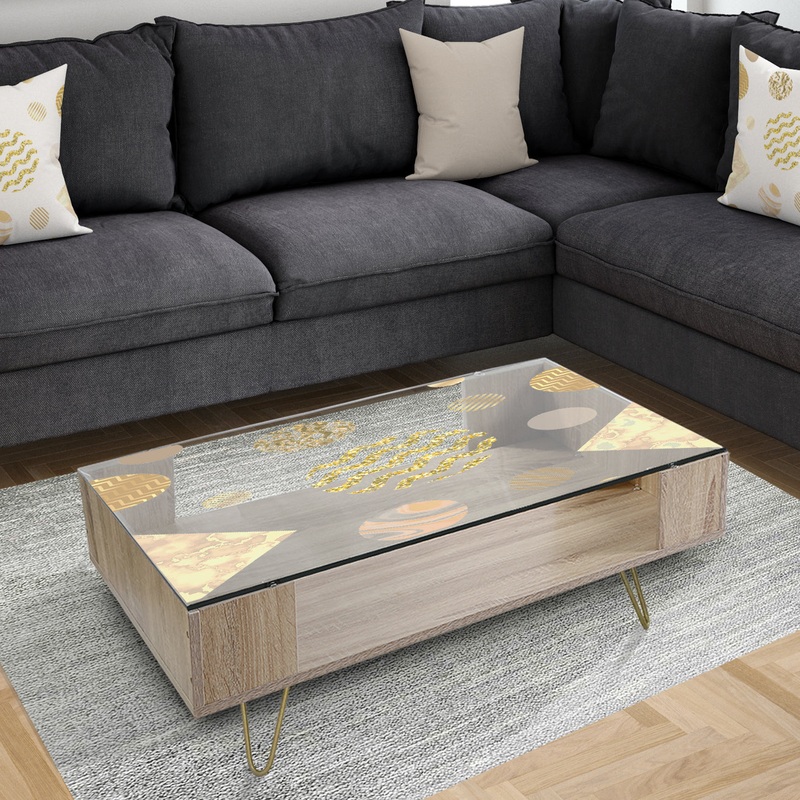 Make your living room decor stand out with this modern coffee table by Designart featuring a lively gold design. The simple box formation of this table offers a sleek, contemporary profile for a sophisticated look, while the edgy design is imprinted under the glass to keep it looking like new for years.