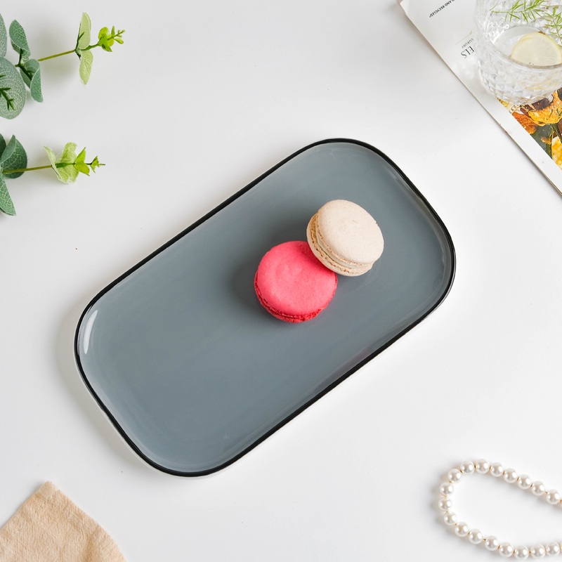 Nestip: The Cara grey rectangle ceramic platter can be used as a rice plate or to present small bowls or cups to guests when placed on it.
