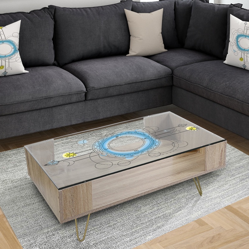 Choose a sensational room focal point when you add this artistic table to your home furnishings. An intriguing print underneath a glass top draws attention from guests, and it stays free of scratches even when you put your coasters and pitcher of juice on the smooth tabletop. A metal base provides robust support.