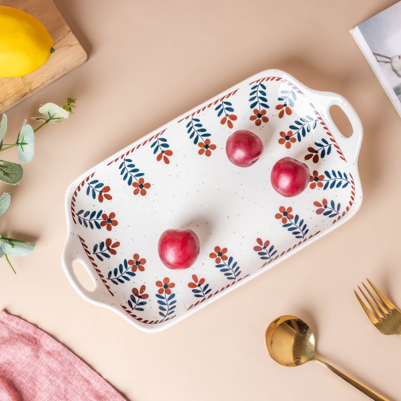 Tea time just got better with the beautifully patterned long ceramic tray. Great for serving some fritters and coffee or tasty hors d’oeuvres, the tray makes serving snacks and beverages an easier feat. The rustic brown floral pattern and speckled surface stand out and the extended handles on the sides will let one carry the tray with ease.