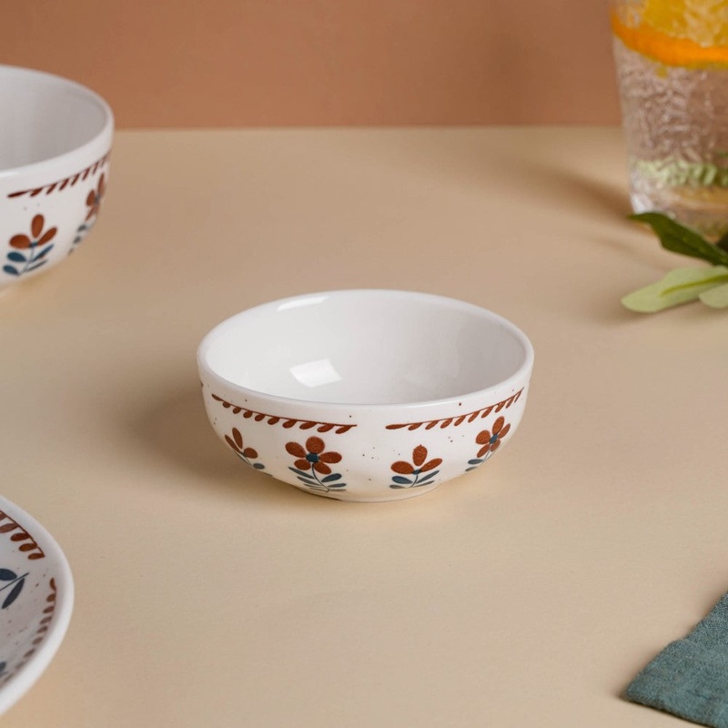 The round ceramic bowl with floral patterns is a small dip plate to serve dips alongside snacks or appetizers. The classic dip bowl is white in color and manufactured with high-quality ceramic. The red florals of the plate enable it to be an ideal addition to the table along with other bright plates and bowls from the collection. Serve cheesy dips or chutneys on the small plate to increase the flavor of delicious kebabs, papads, or sliders and nuggets during a housewarming party or a small house party with friends and family.