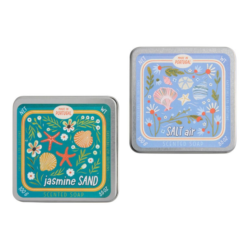Made in Portugal, our moisturizing soap bar is hand packed into a cute tin featuring a range of sea creatures often reeled in by local fishing boats. A sweet gift basket addition, choose from two refreshing scents. Jasmine Sand has top notes of saffron and lemon, middle notes of jasmine and pine and a base of amber, cedarwood and musk. Salt Air is full of beachy and breezy fragrance that evokes paddling in the sea with sand between your toes.