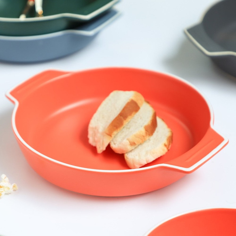 The bright orange baking bowl with a matte finish will stand out in any minimal table setup. The minimalistic and modern design and form of the baking dish lend a stylish yet simple appeal to the bakeware. One can use the ceramic bowl as a bowl for serving main course dishes.