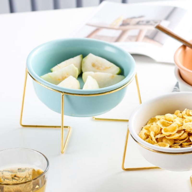 The pastel serving ceramic bowl in a matte blue colour sits pretty on the gold metal stand that can create an elevated look on the table and highlights the presented dish. The bowl stand gives height to the bowl and makes the table setting look clean. Use