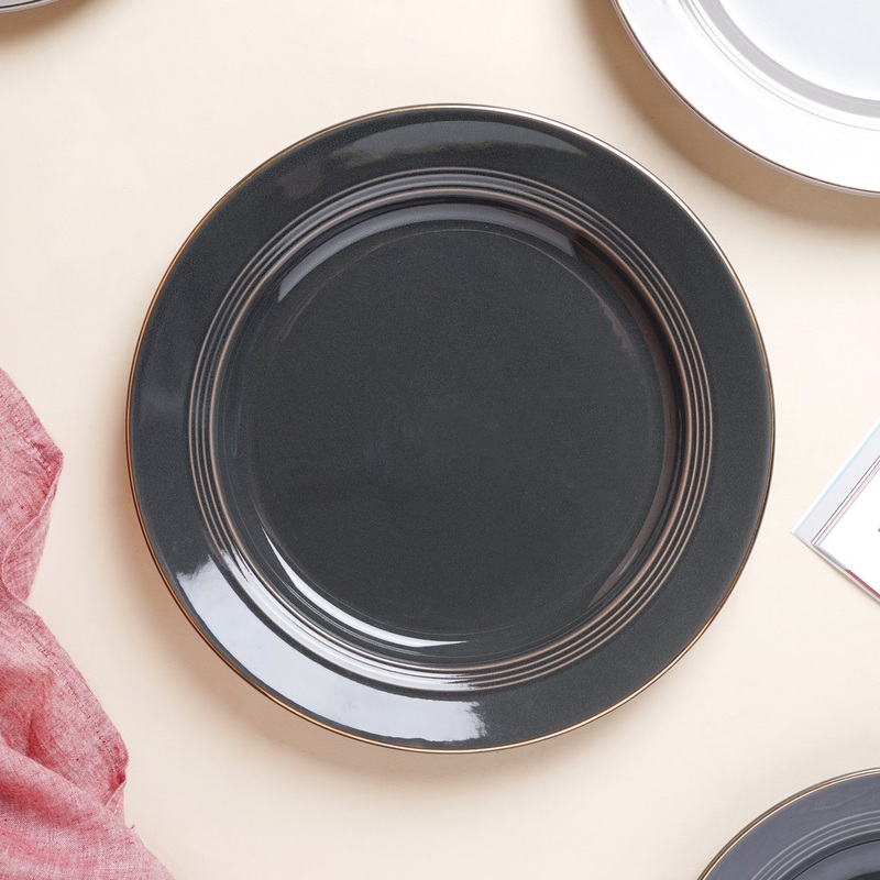The ceramic snack plate features a sleek black colour with a glazed finish to add a combined element of modernity and glam to the table. The surface of the ceramic plate has minimalistic rings of gold to make the snack plate truly luxe. Use the plate to serve appetizers or fritters and fries.